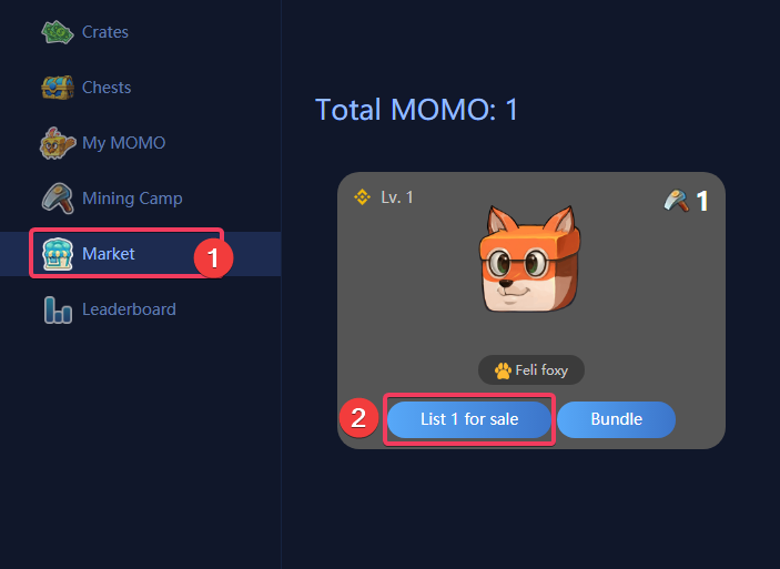 如果你想出售你的MOMO,只需前往平台的"市场"部分。选择您要出售的MOMO并关注提示。 如果您有多个MOMOS,您也可以在启用的捆绑包中销售它们,以便用户可以节省交易费用。