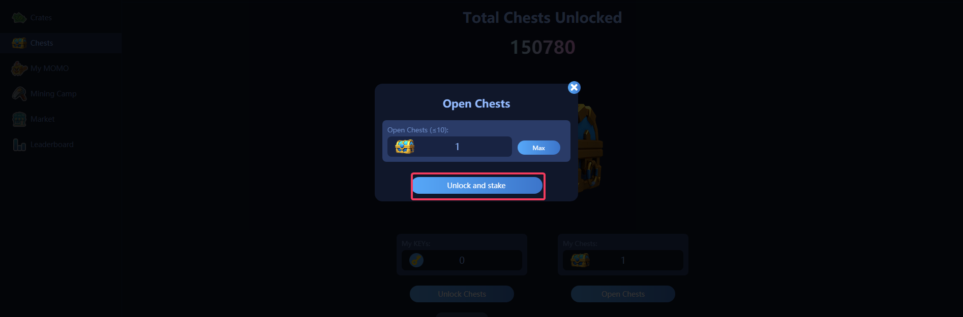 现在您在 Chest 部分拥有您的钥匙,只需单击“解锁并质押”并再次确认交易。您会注意到隆隆声,您已解锁的 MOMO 将显示如下